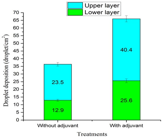 Figure 14 shows the droplet penetrability rates with and without KAO A-200 treatments. The droplet penetrability rate without the adjuvant was 62% higher than the rate with the adjuvant of 51.3% with the adjuvant. The reason for this was that the PEW solution droplets’ coverage of upper and lower layers increased during the aerial spraying after adding the adjuvant, but the droplet coverage rate on the upper layer increased more relatively.