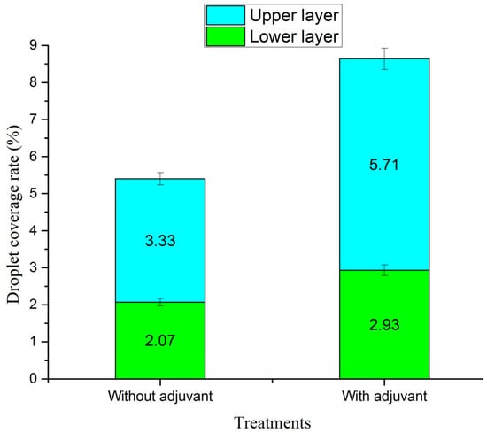 Figure 12 shows the droplet coverage rates of the upper and lower layers. In the aerial spraying treatment conducted without the adjuvant, the droplet coverage rates were 3.33% on the upper layer and 2.07% on the lower layer. However, when an adjuvant was introduced, the droplet coverage rates significantly increased to 5.7% and 2.93% on the upper and lower layers, respectively. The PEW solution droplets, when combined with the adjuvant, exhibited significantly higher coverage rates on both the upper and lower layers. Specifically, there was a 71.47% increase in coverage on the upper layer and a 41.55% increase in coverage on the lower layer. When analyzed in conjunction with the results of droplet coverage density, it is observed that the increase in coverage rate on the upper layer was similar to the increase in coverage density, with values of 71.47% and 73.91%, respectively. However, the droplet coverage rate on the lower layer showed only a slight increase, which was not as significant as the increase in droplet coverage density. The reason for this is that a higher quantity of droplets deposited per unit area corresponds to a higher droplet coverage rate. The droplet coverage rate is determined by the ratio of the droplet coverage area to the sampling WSP area. In addition to the coverage density, the coverage rate is also influenced by the size of the droplets and their spreading efficiency on the WSP.