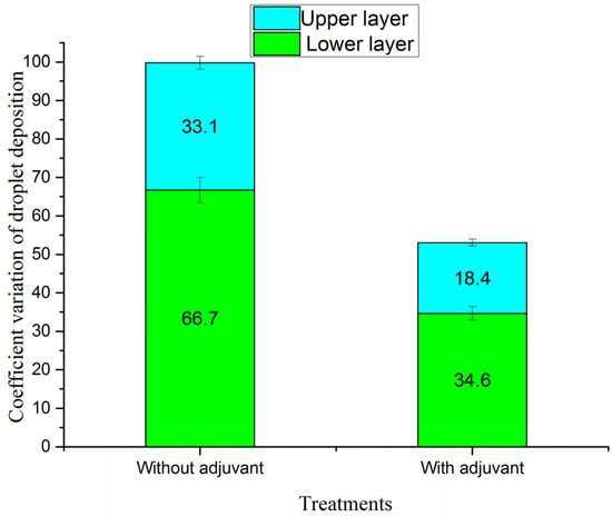 Figure 13 shows the droplet deposition uniformity expressed by CV. Higher CV values indicate a lower level of uniformity in the deposition of droplets. It is evident that the uniformity of droplet deposition on the upper layers was superior to that on the lower layers in both aerial application treatments, with and without the inclusion of additives. The coefficient of variation in droplet deposition exhibited a decrease of 44.41% and 48.13% on the upper and lower layers, respectively. The addition of the additive significantly improved the droplet deposition uniformity. Therefore, the inclusion of an adjuvant can significantly enhance the uniformity of pesticide droplet deposition.