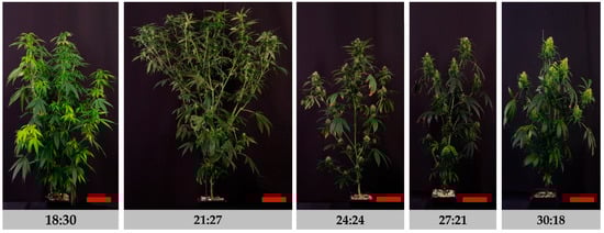 Temperature control is a critical environmental factor that plays a pivotal role in plant growth and development, including that of medical hemp [20,21]. The optimal temperature for hemp cultivation is approximately 24 °C [22], with temperatures above 30 °C or below 20 °C resulting in decreased photosynthesis and nighttime respiration rates [19]. In terms of cannabinoid contents, tetrahydrocannabinol (THC) levels have been reported to increase under low temperatures of approximately 23 °C compared to high temperatures of approximately 32 °C [23]. Plants exhibit various physiological responses to both daily average temperatures and the difference between daytime and nighttime temperatures (DIF). In general, negative DIF conditions are reported to suppress shoot growth in various plant species [24,25]. Considering these effects, DIF treatment can be used in crop cultivation to control plant height, as an alternative to pesticides, and to regulate flowering and fruit quality, among other applications [26,27].