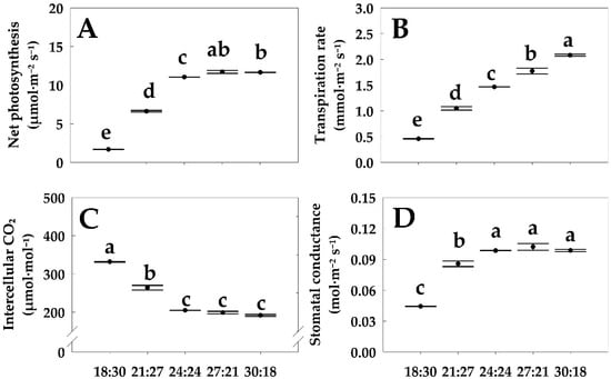 The net photosynthetic rate, transpiration rate, stomatal conductance, and intercellular CO2 concentration were measured in well-developed leaves from the third to seventh leaves of the apical meristem of the main stem using a portable photosynthesis system (LI-6800; Li-COR). All parameters were measured 3 h after turning on the lights, with the CO2 level maintained at 400 μmol·mol−1, the light intensity set to 400 μmol·m−2·s−1, the humidity maintained at ambient levels, and the temperature adjusted according to the specific daytime treatment setting value for each treatment condition.