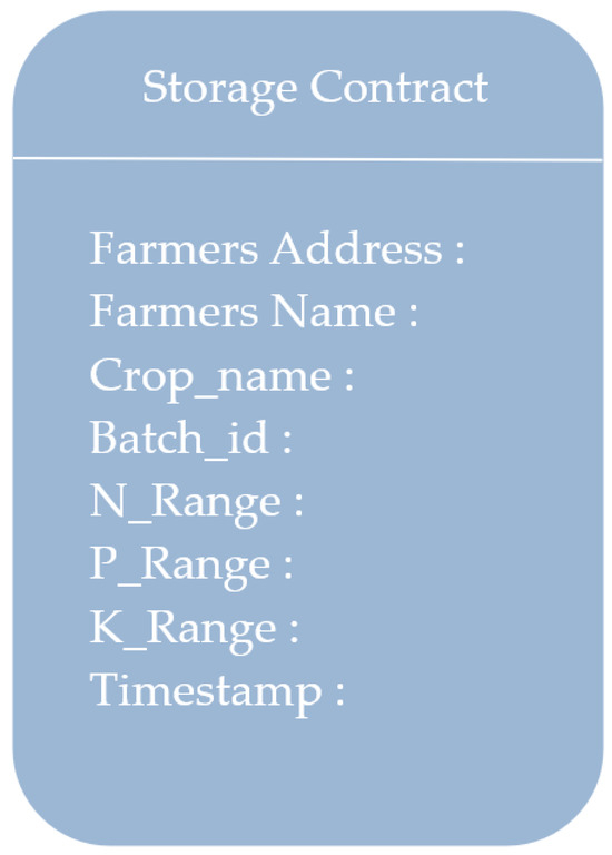 The fourth stage involves the use of blockchain technology. Clean and processed sensor data from the cloud are moved to the next layer. This layer will validate sensor readings, i.e., the N, P, K, and pH readings from the sensors, and it will ensure they are tamper-proof and evident, as shown in Figure 4. Each block on the blockchain will store these readings from the IoT devices along with its timestamp, thus maintaining a record of the real-time data that are fetched from the sensors. Smart contracts automate the process and eliminate the need for dependency on third parties. Smart contracts are essentially self-executing programs written into a blockchain that consists of the terms of an agreement or contract. Once the conditions of the contract are met, it executes the smart contracts, which then automates all the transactions and streamlines various commercial processes. These actions would otherwise need the dependency of third parties. The blockchain provides data security with the use of private and public keys. The data received are securely stored inside the immutable blockchain ledger. Smart contracts thus confirm that data remains secure, thereby preventing unauthorized access or tampering. Thus, no other entity has to verify that the data coming from the sensor is from a genuine actor. The smart contract has several attributes and user-defined functions, as shown in Figure 5. It includes the farmer’s name, address, crop name, batch ID, soil nutrient values, and timestamp. These attributes and functions validate/verify the crop data based on the conditions created in the smart contract. After satisfying all the conditions in the smart contacts, the data are stored in the blockchain [17]. This ensures the authenticity of all the sensor readings as no one can delete or modify the data stored in this blockchain.
