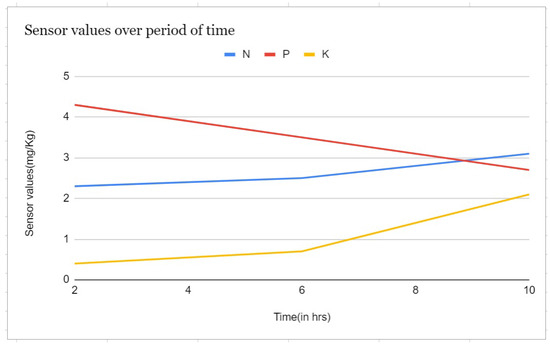 Figure 6 shows the real-time data of the soil nutrients from the sensors at different time instances. The soil nutrients include N, P, K, and the pH. The y-axis depicts sensor values for each nutrient (mg/kg), and the x-axis represents the change in value concerning time (in hours). The graph shows an hourly report outline of the nutritional levels of each nutrient.