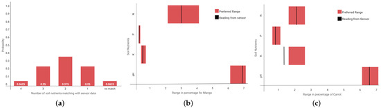 (a) Probability of a number of soil nutrients matching the sensor data. (b) The readings from the sensor for mangoes satisfies the preferred ranges. (c) The readings from the sensor for carrots satisfies only three of the preferred ranges.