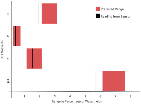Figure 8 depicts the favorable range of soil nutrient values of the crop “watermelon” and its corresponding sensor readings. The orange bar in the graph represents the required range of the soil nutrient values needed to grow watermelon. In comparison, the black line in the graph is the discrete sensor values retrieved from the sensors deployed on a farm. The sensor readings of K and P satisfied the soil nutrient requirements since they were inside the orange bar. In contrast, the sensor readings of N and pH were not inside the orange bar, meaning the K and pH readings did not fall into the required range for growing watermelon.