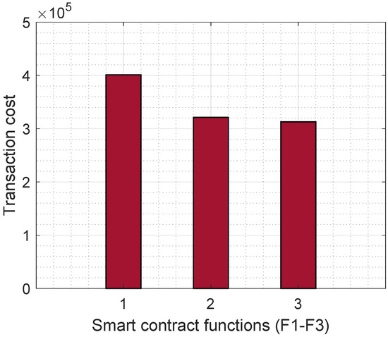 Figure 10 shows the transaction cost when deploying smart contract functions on the distributed and immutable ledger. It refers to the amount of gas required to execute a transaction on the Ethereum-based public blockchain. Here, each function is deployed or executed on the blockchain; this operation consumes computational resources, so a transaction fee is required from the blockchain participants. These resources are measured in gas, a unit of calculation representing the amount of computational work needed to act.