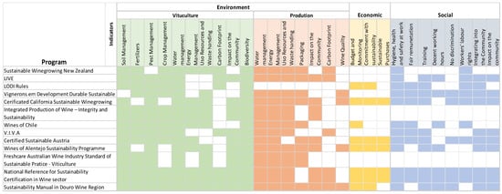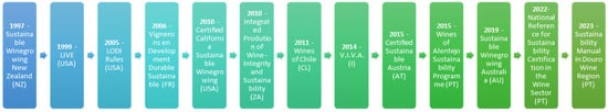 Sustainable certification benchmarks from the oldest to the most recent, showing the most important indicators for each benchmark (legend: green—indicators mentioned in the benchmarks for viticulture; orange—indicators mentioned in the benchmarks for wine production; yellow—economic sustainability indicators mentioned in the benchmarks; blue—social sustainability indicators mentioned in the benchmarks).