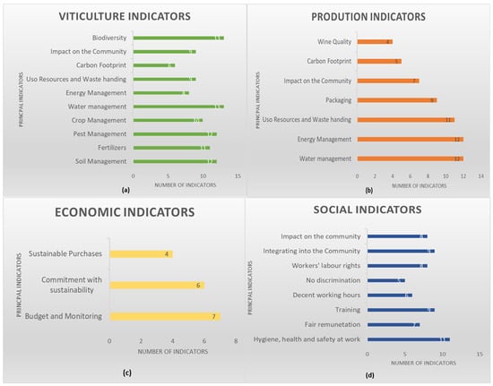 The most important sustainability indicators in the different sustainable certification benchmarks: (a) represents the environmental indicators for the vineyard (green color) and the number of benchmarks that measure them, and the most important are biodiversity and water management; (b) represents the environmental indicators for wine production (orange color) and the number of benchmarks that measure them, and again, water management is an important indicator, as is energy management; (c) represents the company’s economic management indicators (yellow color) and the number of benchmarks that measure them, with budget and monitoring being the most relevant; and (d) represents social indicators (blue color) and the company’s relationship with the community and the number of benchmarks that measure them, with hygiene, safety, and health at work being the most mentioned, but others also appear, such as training and integration into the community.