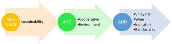 In June 2023, we conducted a literature review on environmental sustainability in wine cooperatives and their difficulties in responding to the new demands of markets and governments. For this analysis, we used two databases, ScienceDirect and Scopus, employing keywords and various combinations of them, i.e., sustainability, environment, cooperative wineries, cooperativism, sustainability benchmarks, and indicators. Figure 5 shows the research strategy. First, the word “sustainability” was included; then “cooperative” was included, then “environment”, and finally different variables were inserted. Some restrictions were imposed: years of publication between 2015 and 2013; only research and review articles; and environmental, agricultural, and social areas. The search resulted in 2628 articles (1850 articles in ScienceDirect, 778 articles in Scopus), from which 126 articles were extracted for analysis. The rest were rejected because they were not associated with the wine sector or cooperativism or environmental sustainability, and because of duplication. Finally, 27 articles were included in this study. No software was used to support the analysis.