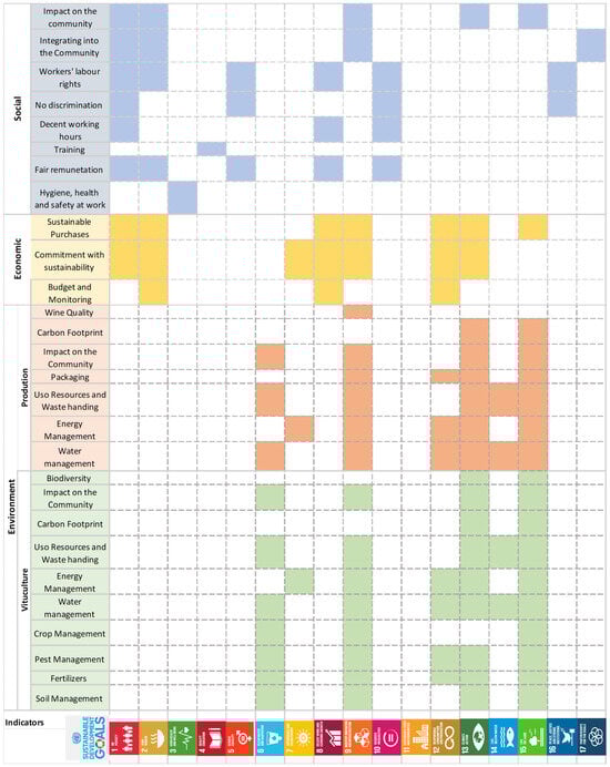 List of indicators identified in the benchmarks and their relationship with the SDGs (legend: green—indicators mentioned in the benchmarks for viticulture; orange—indicators mentioned in the benchmarks for wine production; yellow—economic sustainability indicators mentioned in the benchmarks; blue—social sustainability indicators mentioned in the benchmarks).