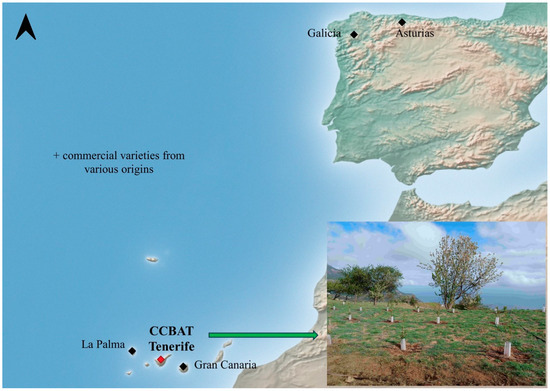 With the objective of recovering and conserving the agricultural biodiversity of Tenerife, the Centre for the Conservation of Agricultural Biodiversity of Tenerife (CCBAT), belonging to the Tenerife Island Council, was created in 2003. Since its creation, this germplasm bank has been part of the National Plan for the Conservation and Use of Plant Genetic Resources (PCURF) of the National Institute for Agricultural Research and Technology (INIA). The CCBAT conserves more than 3200 accessions of agricultural varieties, some of them unique and of great value, such as the potato, which has made it a national reference centre for this species. In addition to identifying and conserving local agricultural varieties, the CCBAT has also characterised conserved material to learn more about it and be able to value it. For example, in temperate fruit trees, Pereira-Lorenzo et al. [1] morphologically and molecularly characterised the chestnut trees of Tenerife and La Palma, and Velázquez-Barrera et al. [4,5] characterised the pear trees (Pyrus spp.) of the islands of Tenerife, La Palma and Gran Canaria as well as part of the CCBAT collection of apple trees (Malus spp.) (42 accessions). Moreover, trees from the other two islands mentioned above have been molecularly characterised using microsatellites [5,6], analysing them with varieties from Galicia, Asturias and Portugal, and by Pereira-Lorenzo et al. [7], who analysed apple tree entries from the Spanish gene bank collection.