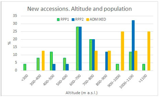 Altitudinal distribution of new CCBAT apple tree accessions analysed for the first time in this research using SSRs by panmictic populations reconstructed from STRUCTURE 2.3.4 software.