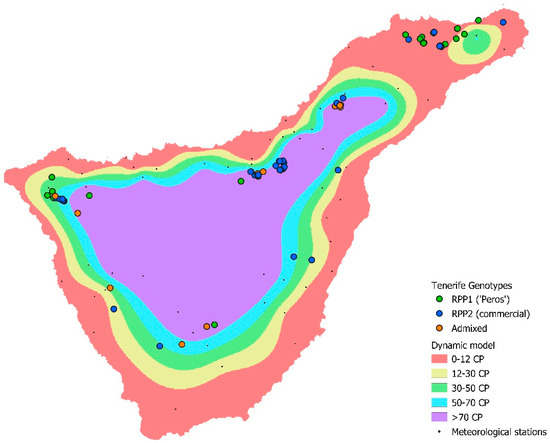 Figure 3 shows the representation of the molecularly analysed apple tree accessions of Tenerife, overlaid on a layer made from the interpolation of the chill portions (CP) of the Dynamic Model [21] calculated in the meteorological stations of the Tenerife Island Council [22]. The red band corresponds to areas with very little winter chill (0–12 CP); green, from 30 to 50 CP; blue, from 50 to 70 CP; and purple corresponds to areas with a very effective chill of more than 70 CP. RPP1 entries were collected in areas with a mean of 49 CP, while those of RPP2 were collected at 69 CP; the correlation, as in the altitude, is significant and positive (0.388, p < 0.01). Considering only the Canary Island genotypes collected in Tenerife and eliminating the commercial varieties and those genotypes also located in the Spanish mainland, the mean chill portions of the places where the accessions assigned to RPP1 were collected was 48 CP, and those of RPP2 were 71 CP. This seems to indicate that RPP1, or at least some of its genotypes, could be better adapted to areas with low chill.