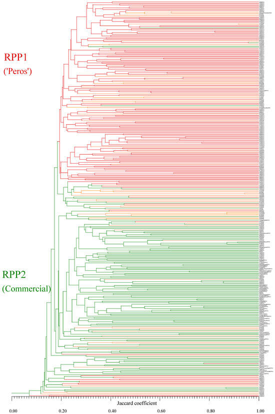 A dendrogram was made with all the different apple genotypes (366), both diploid and putative triploid. The coefficient of co-phenetic correlation was 0.53, showing some distortion, as values of 0.80 or higher are desirable. Figure 4 shows, despite the low value of the coefficient, a representation according to the data obtained in STRUCTURE, with a majority separation of RPP1 genotypes (putative triploids and diploids) in a cluster from Jaccard’s coefficient of 0.20 (in the upper part, in red) and of RPP2 from 0.19, in green. The admixed individuals are shown in orange.