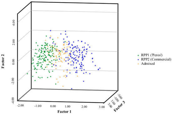 From the binary allele base for the total number of apple tree genotypes (366), a principal component analysis (PCoA) was performed using SPSS statistics software v.28 (IBM, Armonk, NY, USA) according to the reconstructed panmictic populations (RPPs) detected with STRUCTURE 2.3.4 software. The three-dimensional representation of the first three factors separated the two obtained reconstructed panmictic populations, with the genotypes admixed in the middle of the RPPs, confirming the separation between populations observed in the other analyses performed in this research (Figure 5). The genotypes of RPP1 (‘Peros’) had a negative Factor 1 value, with the total number of specimens below −0.11, while in the majority of RPP2 (commercial) (93%), the value of this was positive.