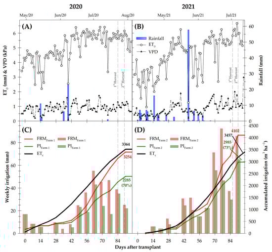 | Irrigation system | Drip irrigation system with one drip line per row and emitters spaced at 0.3 m with a flow rate of 2.2 L h−1. | |