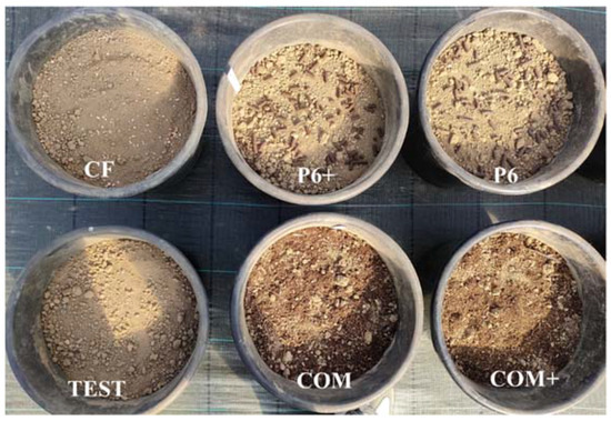 The pots were fertilized at a consistent nitrogen application rate (equivalent to 120 kg N ha−1) [26]. The total nitrogen content of the organic fertilizer was about 1.91%. Therefore, 4 g pot−1 and 44.4 g pot−1 were used in the chemical fertilizer treatment (CF) and organic fertilizer treatments, respectively. Furthermore, 8 g pot−1 of a solution consisting of a microbial consortium composed of rhizospheric bacteria and water in a ratio of 1:20 was distributed via spray on the COM+ and P6+ treatments.