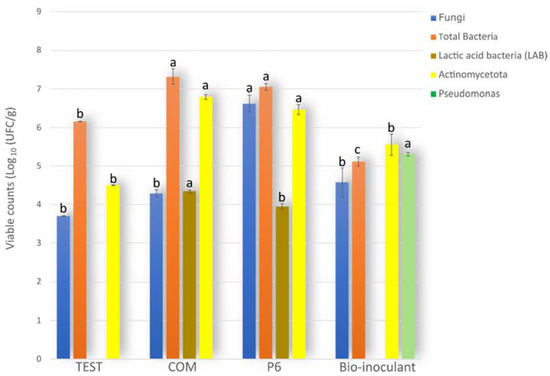 Particularly, the total bacteria, lactic acid bacteria (LAB) and Actinomycetes, were detected at significantly higher populations in the COM and P6 fertilizers. Interestingly, compost pelletizing had a significant effect on the abundance of fungi, which were detected at significantly higher concentrations in P6. The bio-inoculant was characterized by the presence of Pseudomonas spp. and the absence of LAB.