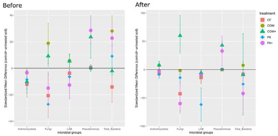Standardized mean difference effect sizes (95% CI) before lettuce transplanting (Before) and after lettuce harvesting (After). For each microbial group, the effect of each fertilizer was determined in comparison to the untreated soil: values > 0 indicate viable counts higher in fertilized than in untreated soil.