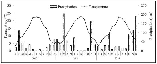 The field experiment was carried out in Suçães (41°29′ N, 7°15′ W), Mirandela, in northeastern Portugal, from September 2016 to December 2019. The meteorological data recorded during the three years of harvest are shown in Figure 1. The orchard characterization, agronomic practices and experimental design have been previously described, and details can be found in Martins et al. (2023) [40]. In brief, the experimental field was divided into three adjacent experimental subplots, each including four rows 60 m in length, with one to receive conventional tillage (T), consisting of two tillage passes per year in spring using a cultivator, and two subplots with a cover crop consisting of a mixture of self-reseeding annual legume species and cultivars. Among the two subplots of cover crop, one received the application of natural zeolites (1500 kg ha−1 year−1) over the mulch (ZL), whereas the other had only the plant debris left on the soil surface (LC). The composition of the legume cover crop, as well the properties of the applied zeolites, provided by the manufacturer (ZeoCat, Barcelona, Spain), can be found in Martins et al. (2023) [40].