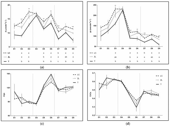 Evolution of leaf gas exchange variables in tillage (T), leguminous cover crops (LC) and zeolite (ZL) treatments during the summer of 2017 (D1, D2 and D3), 2018 (D4, D5 and D6) and 2019 (D7, D8 and D9). Net photosynthetic rate (a), stomatal conductance (b), intrinsic water use efficiency (A/gs) (c) and intercellular to atmospheric CO2 concentration (Ci/Ca) (d). Each point with vertical bars represents the average and S.E., respectively. Different letters indicate significant differences among treatments within each date. Significance: * p < 0.05; ** p < 0.01; *** p < 0.001.