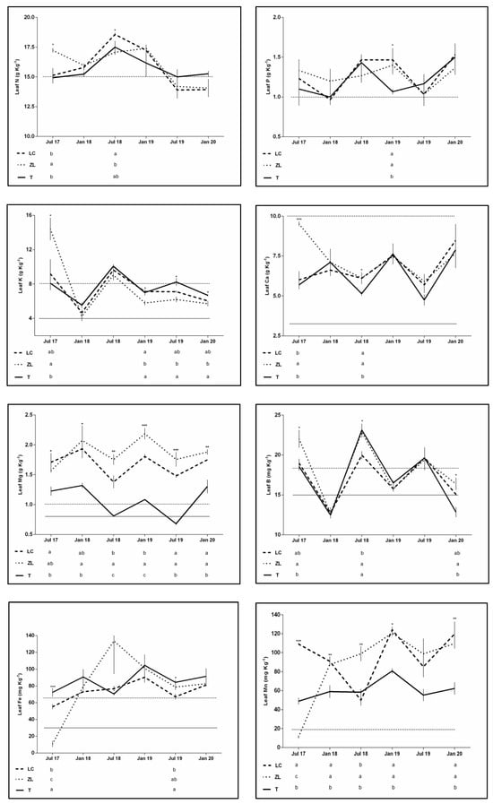 Leaf N, P, K, Ca, Mg, B, Fe and Mn concentrations from July 2017 to January 2020 of tillage (T), leguminous cover crop (LC) and zeolite (ZL) treatments. Each point with vertical bars represents the average and SE, respectively. Different letters indicate significant differences among treatments within each date. Dashed and solid lines are, respectively, the lower limit of the adequate range and the deficiency threshold for summer sampling, from Fernández-Escobar [49]. Significance: * p < 0.05; ** p < 0.01; *** p < 0.001.