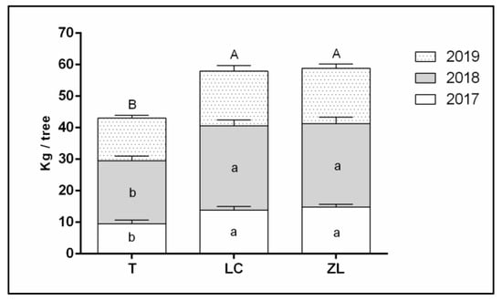 Variation in crop yield (kg tree−1) from 2017 to 2019 on tillage (T), leguminous cover crop (LC) and zeolite (ZL) treatments. Capital and lowercase letters are the result of ANOVA and Tukey’s HSD test for the accumulated yield and for the yield from each year, respectively. Vertical bars are the standard errors.