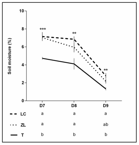 Soil moisture of tillage (T), leguminous cover crop (LC) and zeolite (ZL) treatments during the year of 2019. Different letters indicate significant differences among treatments within each date. Significance: ** p < 0.01; *** p < 0.001.