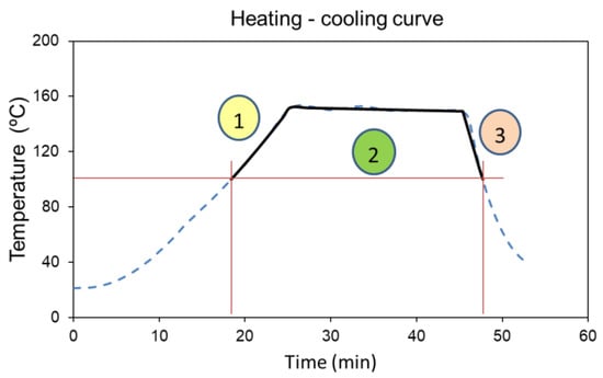 For all tests, a typical temperature profile is shown in Figure 1. Where the number 1 corresponds to the heating curve, 2 to the period at operating temperature, and 3 to the cooling curve.