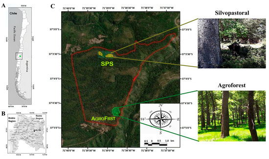 Approximation maps of the study site at (A) national and (B) regional levels (Source: Maps from Nations Online Project 2016, http:///www.nationsonline.org/oneworld/map/chile-political-map.htm, accessed on 18 January 2023). (C) Satellite image of Ranchillo Alto (demarcated in red), a 635 ha property consigned to the Universidad de Concepción in the Ñuble Region (120 km east of Concepcion City), and the study sites AGROFRST (37°04′43″ S, 71°38′41″ W; 1260 m.a.s.l.) and Silvopastoral (37°03′36″ S, 71°39′14″ W; 1290 m.a.s.l.), both 6 ha in size (each subdivided into 2 ha plots). (After Dube et al. [38] and Leal et al. [40]). Photographs of the two systems above are the (i) SPS, composed of oak (Nothofagus obliqua) and coihue (Nothofagus dombeyi) at a tree density of 173.3 stems ha−1 (133.3:40, respectively), corresponding to 65–75% of solar irradiance, whereas the understory includes introduced associations of Vicia (Fabaceae purpurea), clover (Trifolium incarnatum, T. subterraneum, and T. vesiculosum), Lolium multiflorum westerwoldicum, Phalaris acuatica, Lolium perenne, Festuca arundinacea, Dactylis glomerata, natural re-sprouting Radal (Lomatia hirsuta), and sprouts of Quila (Chusquea quila). Below is the (ii) AGROFRST, composed of oak (Nothofagus obliqua) at a tree density of 446.6 stems ha−1 (35–45% of solar irradiance) and oats (Avena sativa)-vetch (Vicia atropurpurea) as an herbaceous component (Photos credit: F. Dube, 2019).