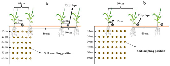 The drip tape layout and soil sampling positions in the field experiment. (a) One tape serving for two crop rows; (b) one tape serving for each crop row.