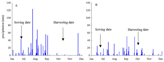 Daily precipitation during the maize growth seasons in 2020 (A) and 2021 (B). Maize was planted on 21 June in both experimental years, and harvested on 15 October in 2020 and 3 October in 2021.