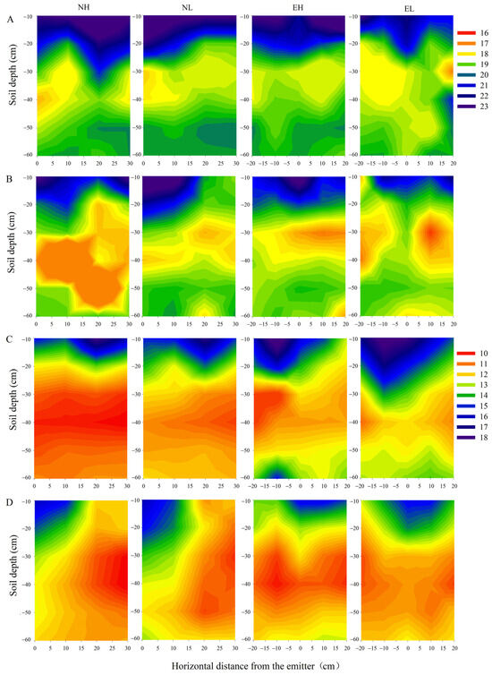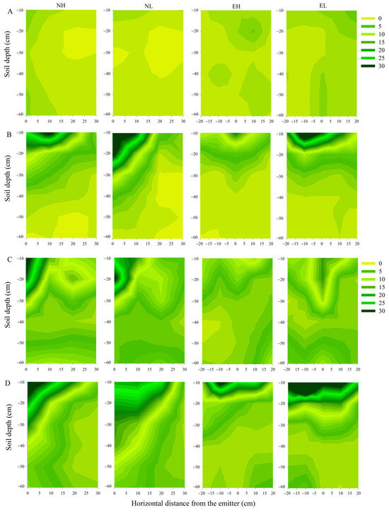 Effects of drip tape layout and drip emitter flow rate on nitrate distribution in 2020 and 2021. The nitrate distribution at R1 in 2020 before drip irrigation (A) and after drip irrigation (B). The nitrate distribution at R1 in 2021 before drip irrigation (C) and after drip irrigation (D).