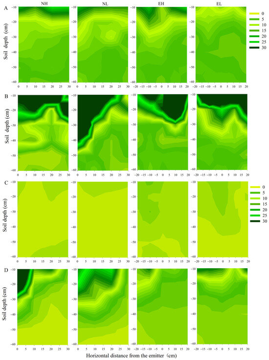 In terms of vertical nitrogen transport distance, in 2021, nitrate nitrogen could be transported to a 60 cm soil layer under both NL and NH treatments, whereas under EH and EL treatments, it was mainly distributed above a 40 cm soil layer. In 2020, under NL treatment, nitrate nitrogen was transported to a 55 cm soil layer, which was 22.22%, 71.42%, and 57.14% deeper than that observed under NH, EH, and EL treatments, respectively. In the horizontal direction, the maximum nitrate transport distance exceeded 40 cm for each treatment in both years, and the maximum horizontal distance was at a 0–10 cm soil profile.