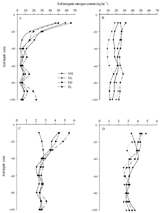 The sampling points in vertical directions were located every 10 cm from the soil surface. Each soil sample was divided into two parts to determine soil moisture content and ammonium nitrogen and nitrate nitrogen content, respectively. Each treatment was repeated three times, with an average value of three points. Soil moisture content was determined using the gravimetric method (oven dry basis). To determine ammonium nitrogen (NH4+-N) and nitrate nitrogen (NO3−-N) contents, fresh soil samples were added to 0.01 mol L−1 calcium chloride and shaken for 1 h. After filtration, the NO3−-N and NH4+-N contents from the extracts were immediately measured using a continuous flow analyzer (AA3, Bran and Luebbe, Norderstedt, Germany).