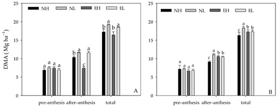 DMA was not significantly different at pre-anthesis among the treatments between two years (Figure 7). However, it was significantly different at post-anthesis among the treatments (p < 0.05). In 2020, under NL treatment, the total aboveground DMA increased by 11.11%, 16.64%, and 3.49%, and the DMA at post-anthesis increased by 12.27%, 28.87%, and 0.47%, compared with NH, EH, and EL treatments, respectively. In 2021, under NL treatment, the total DMA increased by 12.02%, 5.74%, and 5.67% and by 21.12%, 4.55%, and 5.72% at post-anthesis, compared with NH, EH, and EL treatments, respectively.