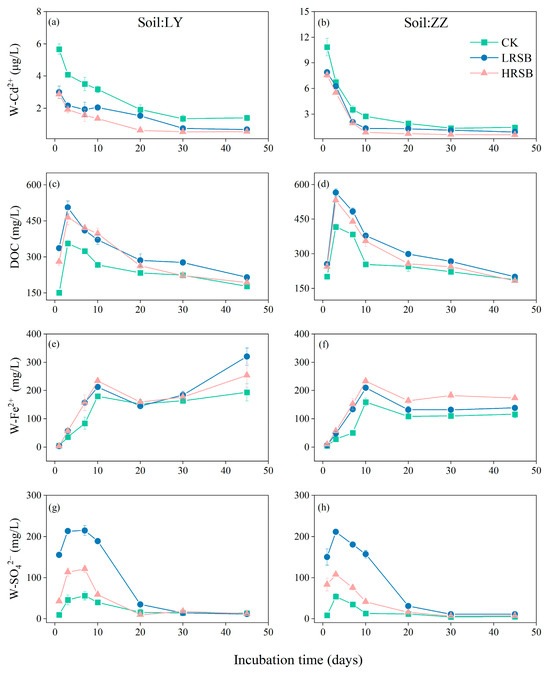 Dynamics of W-Cd2+ (a,b), soil DOC (c,d), W-Fe2+ (e,f), and W-SO42− (g,h) in LY and ZZ soils under anoxic conditions for batch experiments. The data are expressed as the mean ± SD, n = 3.