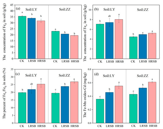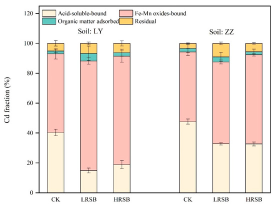 The Fe-Mn oxides Cd concentration in the RSB treatments, particularly in the HRSB treatment, increase by 54.6% and by 42.5% in LY and ZZ soils, respectively, compared to CK (Figure 4). The Fe-Mn oxide Cd in the HRSB treatment was higher by 20.6% in LY, and by 16.8% in ZZ soils, respectively, compared to the LRSB treatments.