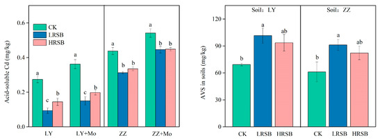 The concentrations of acid-soluble Cd are shown in Figure 5. The concentration of acid-soluble Cd in the LRSB and HRSB treatments significantly decreased by 65.9% and 47.4% in LY, respectively, and by 28.5% and 23.5% in ZZ, respectively (Figure 5). Molybdate addition was found to increase acid-soluble Cd by inhibiting sulfate reduction (Figure 5). In comparison to the biochar treatments with molybdate addition, the acid-soluble Cd concentration in LRSB and HRSB was lower by 37.8% and 27.0% in LY, and by 29.8% and 25.3% in ZZ, respectively. However, acid-soluble Cd in CK was lower by 24.2% and 19.1% in LY and ZZ, respectively, than that in soil with a molybdate addition. This suggested that the contribution of sulfate reduction to Cd immobilization was significantly improved by RSB, especially for LRSB addition in LY soil. The concentrations of available SO42− and acid-volatile sulfide (AVS) in soil are shown in Table 1 and Figure 5. LRSB application increased AVS by 46.4% and 48.9% in LY and ZZ, respectively, compared to CK. AVS in LRSB was 8.4% and 10.8% higher than that of HRSB in LY and ZZ soils, respectively.