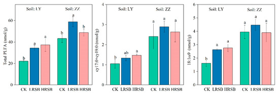 The 20 PLFAs were identified as microbial-based PLFAs and are presented in Figure 6. The total PLFA in ZZ was 2.0-fold higher than that in LY. Compared to CK, total PLFA in the LRSB and HRSB treatments increased by 55.5% and 69.0% in LY and by 36.0% and 12.9% in ZZ, respectively. The PLFA of cy17:0 and cy19:0 in ZZ was 2.3-fold higher than that in LY. The PLFA of cy17:0 and cy19:0 significantly increased by 26.1% and 39.5% in the LRSB and HRSB treatments in LY compared to CK. The PLFA of 18:1ω9 in ZZ was 2.4-fold higher than that in LY. The 18:1ω9 in the LRSB and HRSB treatments increased by 62.4% and 70.4% in LY soil.
