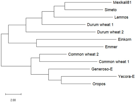 As shown in the phylogenetic tree (Figure 2), two branches were formed. All the common wheat samples were placed on one branch, with all the other samples on the other. Durum wheat samples formed a tight cluster within the branch, while emmer and einkorn samples were found in close proximity to durum wheat.