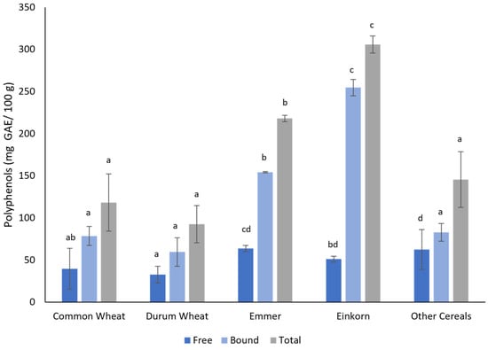 The concentration of polyphenols and flavonoids followed the same pattern, where emmer and einkorn samples exhibited significantly higher values of bound and total content. The concentration of free polyphenols ranged from 32.88 to 62.57 mg of gallic acid equivalent/100 g, exhibiting the highest value in other cereals, and more specifically in barley, and the lowest in durum wheat. Bound polyphenols had values of 59.68–254.74 mg of gallic acid equivalent/100 g, with the highest value measured in einkorn and the lowest in durum wheat. Total polyphenols, estimated as the sum of free and bound values, ranged from 92.56 (durum wheat) to 305.86 (einkorn) mg of gallic acid equivalent/100 g. The concentration of free polyphenols and flavonoids did not vary significantly between emmer, einkorn and other wheat or cereal samples. Free flavonoid values ranged from 5.63 to 10 mg of quercetin/100 g, with the highest value measured in emmer and the lowest in durum wheat. Bound flavonoids were measured higher than free in all the samples, at 11.59 (other cereals) and 37.34 (einkorn) mg of quercetin/100 g, while total flavonoids were found at 18.77 and 43.5 mg of quercetin/100 g in durum wheat and einkorn, respectively. Both polyphenols and flavonoids showed great variation in common wheat and other cereals, as a result of the differences observed within each group (Table S1).