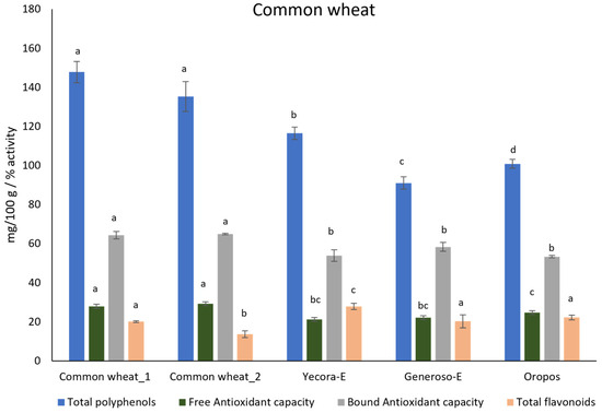 Concentration of total polyphenols (GAE mg/100 g), total flavonoids (quercetin mg/100 g), free and bound antioxidant capacity (% scavenging activity) of the 5 samples of common wheat. Different letters within each value (total polyphenols, free antioxidant capacity, bound antioxidant capacity, total flavonoids) indicate statistically important difference (p ≤ 0.05).