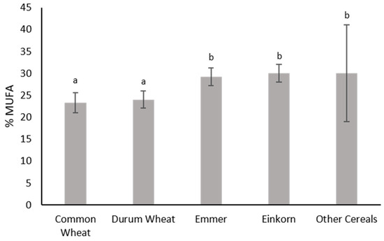 The fatty acid analysis revealed five main fatty acids present in all samples. These were, in order of decreasing amounts, linoleic acid (C18:2) > palmitic acid (C16:0) ≈ oleic acid (C18:1) > eicosenoic acid (C20:1, cis-11) > stearic acid (C18:0) (data not shown). Linoleic acid ranged from 49 to 57.52% of total fatty acids, with the lowest value observed in other cereals and the highest in common wheat. Einkorn and emmer had linoleic acid at a percentage of approx. 51%. The percentage content of mono-unsaturated fatty acids (MUFA) is shown in Figure 8. Emmer (29.20%) and einkorn (30%) had significantly higher % MUFA than common and durum wheat, measured at 23.26% and 24%, respectively. Interestingly, oat had the highest percentage of all samples, at 42.26% (Table S1), two times higher than other cereals, due to the great variation observed within this group.