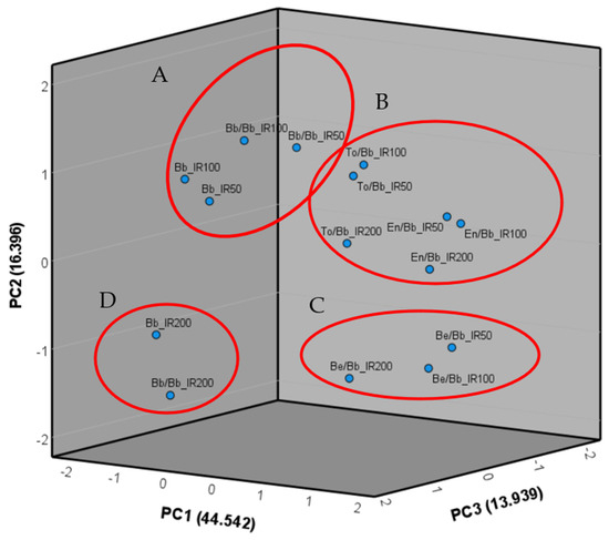 PCA plot showing the genotypes distribution based on the three axes, which are represented by PC1, PC2, and PC3. The different rootstock–scion combinations, along with their respective irrigation regimes, were grouped into four categories (A, B, C, and D). Group A consisted of the self-grafted and non-grafted eggplant cultivar Black Bell, grown under both ordinary and halved irrigation regimes (IR100 and IR50, respectively). Group B included the most promising combinations in terms of yield, cultivated under all irrigation regimes (To/Bb and En/Bb). Group C comprised the Beaufort F1 rootstock grown under all irrigation regimes, characterized by grafting incompatibility with the scion Black Bell. Finally, Group D encompassed the least favorable combinations in terms of agronomic performance, consisting of non-grafted and self-grafted Black Bell plants grown with double the usual water volume (IR200).