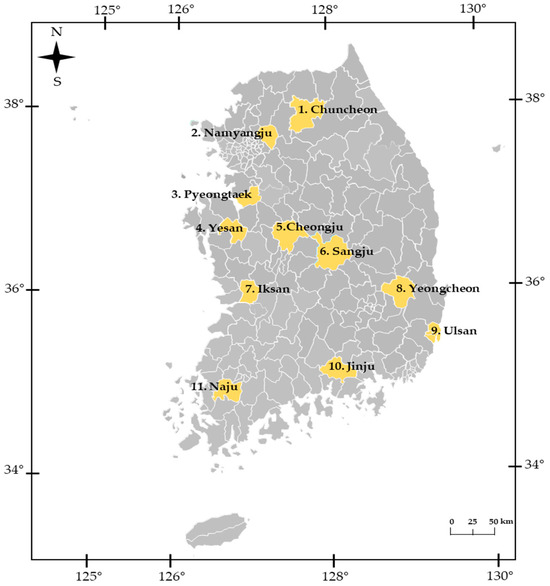 - Rural Development Administration. Map of Pear Plantation Changes; Rural Development Administration: Suwon, Republic of Korea, 2010. [Google Scholar]