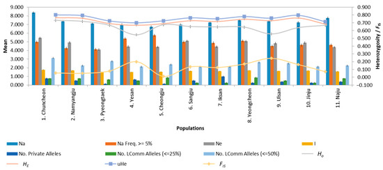 The allelic patterns across populations showed no obvious difference overall (Figure 3, Table S8). The number of alleles (Na) per population ranged from 6.75 (standard error (SE) = 0.881; locality 5, Cheongju) to 8.375 (SE = 1.295; locality 1, Chuncheon). The Na did not significantly vary among populations when SE was considered. The number of effective alleles (Ne) ranged from 4.106 (SE = 0.731; locality 3, Pyeongtaek) to 5.451 (SE = 1.138; Chuncheon), without statistical significance. The Chuncheon population had the highest Na and Ne. The number of private alleles, which corresponded to the number of alleles unique to a single population, ranged from 0.125 (SE = 0.125; Pyeongtaek and Cheongju) to 1.0 (SE = 0.378; locality 7, Iksan), without statistical significance, suggesting that population-specific alleles are uncommon. The within-population gene diversity, which corresponds to HE in the diploid data, ranged from 0.667 (SE = 0.065; locality 4, Yesan) to 0.767 (SE = 0.037; Chuncheon), with a mean value of 0.721 and without statistical significance among populations when SE was considered. Similarly, HO did not show significant differences among populations, ranging from 0.546 (SE = 0.077; Yesan) to 0.730 (SE = 0.078; Chuncheon), with a mean value of 0.649. All populations showed higher HE than HO values, although the difference was not significant when SE was considered. All populations showed positive FIS, ranging from 0.011 (SE = 0.059; Cheongju) to 0.243 (SE = 0.112; locality 9, Ulsan), indicating that they were subjected to inbreeding. The FIS values were not substantially different among populations when SE was considered.