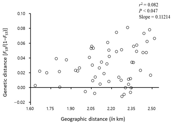 FST analysis of C. jukyungi populations showed a total of 18 statistically significant estimates among 55 comparisons at the level of p < 0.05 or p < 0.01, but no population pair showed a significance level of p < 0.001 (Table 5). Namyangju (locality 2) had the highest number of populations that were significantly divergent at ten populations, and other populations ranged from one to six. The only population that showed no significant divergence from those in Namyangju was geographically the closest Chuncheon. Thus, genetic distance appears to reflect geographic distance in this case. However, other population pairs at varying geographic distances showed a jagged genetic distance inconsistent with geographic distance. For example, Chuncheon and Cheongju populations, which are ~140 km apart, had a statistically significant genetic distance (FST = 0.06120; p < 0.05), whereas Chuncheon population and Jinju population (locality 10), which are ~300 km apart, showed no statistically significant genetic distance (FST = 0.01695; p > 0.05). Similarly, Ulsan and Jinju populations, which are ~50 km apart, had a statistically significant genetic distance (FST = 0.05357; p < 0.05), whereas Ulsan and Pyeongtaek populations, which are ~250 km apart, did not show any statistically significant genetic distance (FST = 0.02343; p > 0.05). IBD analysis results support a weak isolation by distance, providing only a marginally significant association and a very low coefficient of determination (r2 = 0.082; p = 0.047; Figure 4).