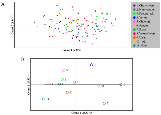 The PCoA results showed the genetic relationships among individuals and populations (Figure 5). The first two principal coordinates of individual genotypes explained only 13.27% of the total genetic variance (6.93% and 6.34%, respectively; Figure 5A). Most individuals had overlapped and clustered positions in relation to each other, excluding only a few individuals that were located at each margin of the first or second coordinates, indicating that most individuals of C. jukyungi are genetically related to each other. In contrast, population-based analysis showed a more distinct separation, dividing the eleven populations roughly into two main groups (seven in the left group and four in the right group), based on the first principal coordinate, which accounted for 43.53% (Figure 5B). However, this division appears not to be decisive considering substantially larger within-group distances (Figure 5B). The second component, which accounted for 27.35% of the variation, did not clearly divide populations into any discernable groups, although a couple of populations (e.g., Namyangju and Yesan) were placed at the margins by the second component. Collectively, PCoA analysis did not provide a clear pattern of separation in terms of individuals and populations.