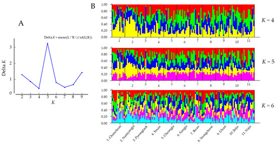 Clustering analysis of multilocus microsatellite data of Cacopsylla jukyungi performed using STRUCTURE software. (A), plot of Delta K calculated with the formula Delta K = mean (|L″(K)|)/sd(L(K)), n = 132. (B), bar plots of estimated membership of each individual in K = 4, 5, and 6 clusters. Black bars separate the 11 populations. Different colors represent different gene pools.